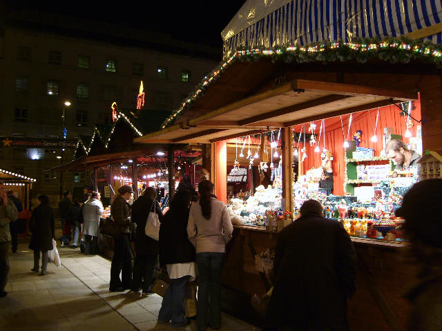 いろんな屋台にクリスマスの飾りやキャンドル、おもちゃ、オブジェ、お菓子、シュトーレン(ドライフルーツが入ったちょっと固めのパウンドケーキみたいな感じ)などなどが売られている。
